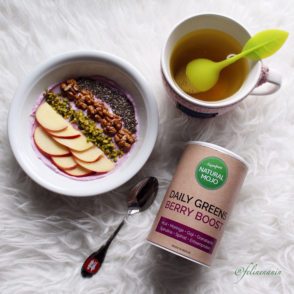 Ich mixe mein “Daily Greens – Berry Boost“ gerne morgens in meinen Jogurt und gebe dazu noch ein paar Früchte oder Müsli dazu und dann heißt es genießen! 🙂