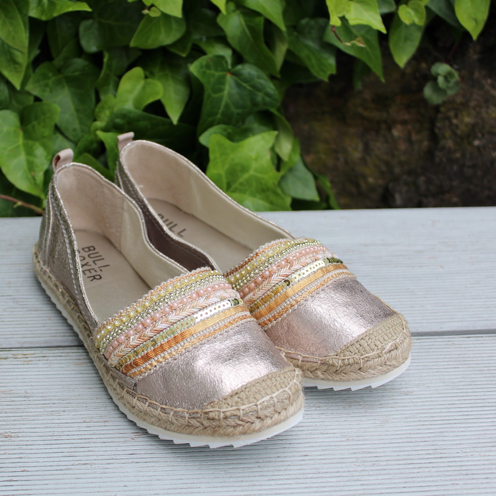 Meine eigenen Erfahrungen mit der Trendmarke Bullboxer sind durchweg sehr positiv. Was mir besonders gut gefällt ist der richtige Mix aus lässig und chic und das die Schuhe mit so viel Liebe zum Detail designt wurden. Meine Espandrilles sind aus Bast gefertigt und glänzen im angesagten Metallic Look. Sie sind mit Schmucksteinchen als Zierapplikationen versehen und durch die weiche gepolsterte Innensohle und die weichen Einfasskanten nicht nur mega bequem, sondern haben auch eine richtig gute und dicke Laufsohle. Sie tragen mich problemlos auch mal durch ne Pfütze da die Sohle auch rutschhemmende Eigenschaften hat.