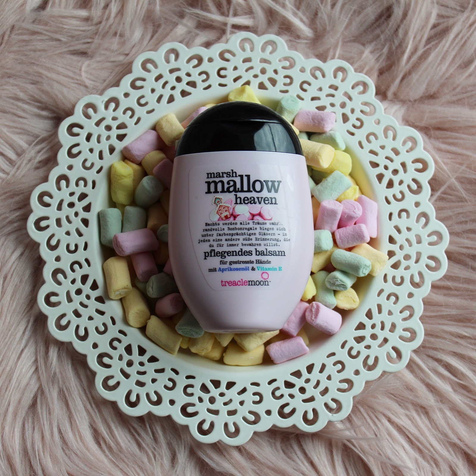 Erstmal muss ich sagen, dass ich die Aufmachung (Lebkuchenhäuschen /Marshmallows) und Verpackung ja zuckersüß finde. Puderzuckrig, rosa und knuddelsüß – mit dem träumerischen Duft MARSHMALLOW Heaven schweben nicht nur Naschkatzen in den siebten Süßigkeitenhimmel. Ein Mix aus Zuckerwatte und süßen gebrannten Mandeln wie auf dem Weihnachtsmarkt. Die Süße ist genau richtig, nicht zu süß. Ein bißchen riecht es wie frisch geröstete Marshmallows vom Grill.Die Creme ist ein intensives und schnelles Rettungsprogramm für trockene Hände. Mit Aprikosenöl und Vitamin E.Auf der Hand kommt der Geruch von Marshmallows richtig durch und hält zudem noch den ganzen Tag. Das gefällt mir richtig gut. Sie ist sehr ergiebig und wird somit wohl lange Zeit halten. Sie pflegt optimal, zieht schnell ein und hinterlässt kein klebriges Gefühl.