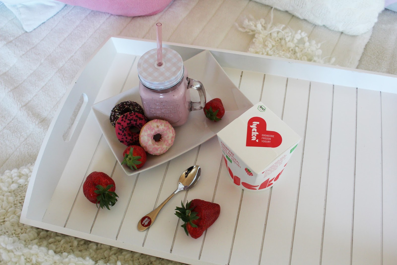 Ich hatte das große Glück, zwei verschiedene Sorten Lycka zu testen. Ich bekam das Eis per Post zugeschickt und war richtig überrascht, wie gut die Kühlung funktioniert hat. Das Eis war dank der Styroporbox und des Trockeneises absolut tiefgekühlt, obwohl es bestimmt schon viele Stunden durch Deutschland transportiert wurde. Das Eis befindet sich in Pappbechern. Die Becher sind wiederverschließbar und mit ganz süßen Aufklebern verziert. Meine Lieblingssorte z.B. die Erdbeere hat ein rotes Herz auf der Oberseite! Das Lycka Erdbeere-Eis war MEIN Favorit. Dieser Frozen Yogurt macht Erdbeerträume endlich wahr. Bio-Joghurt und Bio-Erdbeeren – klingt doch lecker? Es war ein so himmlischer Genuss und angenehm süß (nur durch Bio-Rohrzucker und Bio-Agavensirup gesüßt) – eine wunderbar erfrischende Erdbeer-Schlemmerei. Ich hab mir verschiedene Kreationen ausgedacht z.B:durch frische Erdbeeren oder Knuspermüsli noch ergänzt.