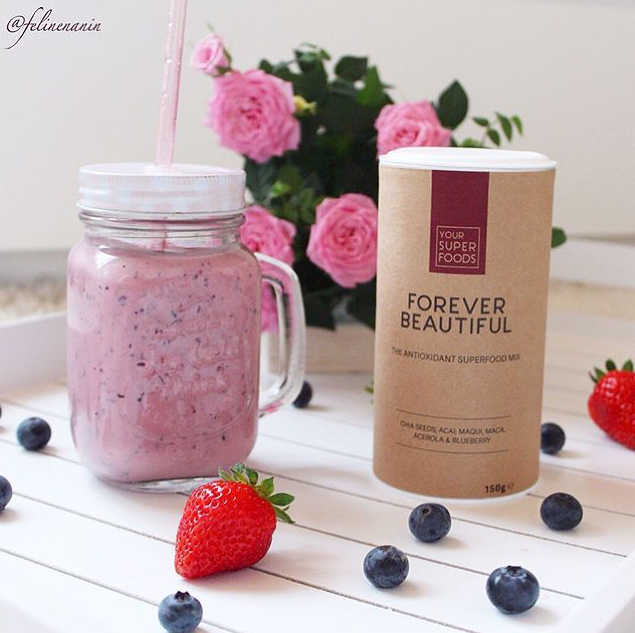 Forever Beautiful Mix, 150 g – 21.90 EUR Der Bio Forever Beautiful Mix wurde speziell für den Zellschutz, die Revitalisierung von Zellen, die Hormonbalance und die Stärkung von Haut, Haaren, Knochen, Nägeln und der Sehkraft entwickelt. Er ist reich an Vitamin A, B3, B6, C, E, Eisen, Phosphor, Kalium und Zink. Der Mix enthält einen hohen Anteil an Antioxidanten, insbesondere Chia,Acai,Maqui die unter anderem den höchsten ORAC-Wert (Der ORAC-Wert gibt an, wie schnell ein Lebensmittel freie Radikale neutralisiert.) aller Beeren besitzen, Maca, Acerola und Blaubeeren. Die Beeren sind ein wahres Anti-Aging-Wundermittel und fördern außerdem Verdauung und Immunsystem. Der Mix läßt sich in Wasser oder anderen Flüssigkeiten auflösen.